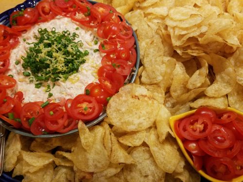 Check once again for any pin bones in the salmon and remove. Flake the fish and add it and the smoked salmon to the mayonnaise and gently fold to combine. Spoon into a serving dish and garnish with lemon zest and thinly sliced chives. Store covered in the refrigerator until thirty minutes before serving time. If you want to be creative or cut the richness of the salmon rillettes, scater or circle with a wreathe of thinly sliced cherry or grape tomatoes. Serve with kettle-style potato chips for dipping or thin crisp crostini for spreading.